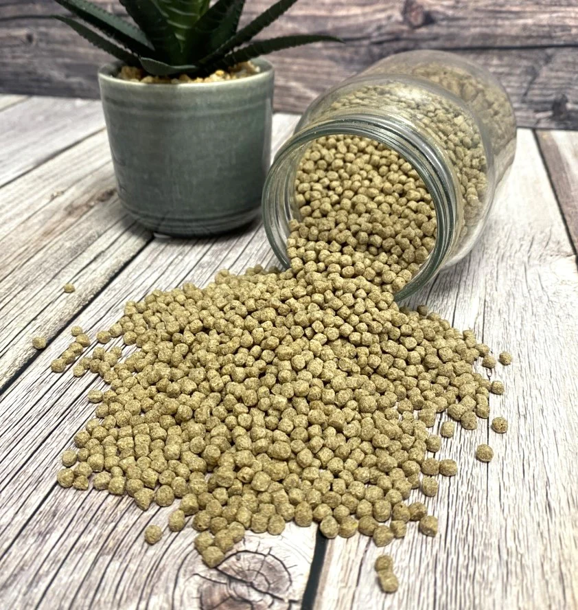 Small floating pellets with a high wheatgerm content and added spirulina, approx. 5mm in diameter, light brown colour