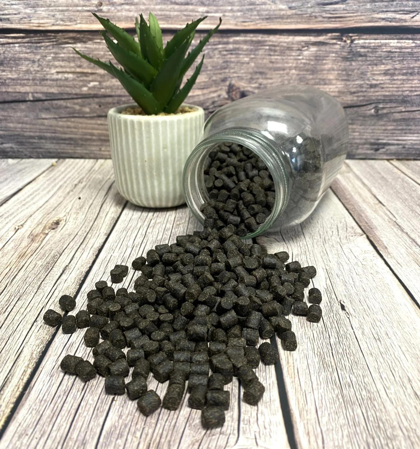 A high oil sinking pellet, black in colour, particularly good for halibut and sturgeon