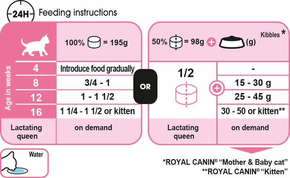 Royal Canin's Mother & Babycat Mousse is an exclusive and highly preferred texture by young kittens because of how palatable it is and how easy it is for them to eat. Newborn kittens receive immunity through colostrum. This helps them fight infectious diseases and environmental pathogens during the first weeks of their life. The maternal-induced protection decreases over time and the immune system of the kitten will gradually take over, developing an immune response following vaccinations and encounters with the local germs. Mother & Babycat supports the development of the kitten's healthy immune system with the inclusion of a complex including vitamins E and C. Mother & Babycat is enriched with omega-3 fatty acids which support a kitten's brain development and healthy vision.