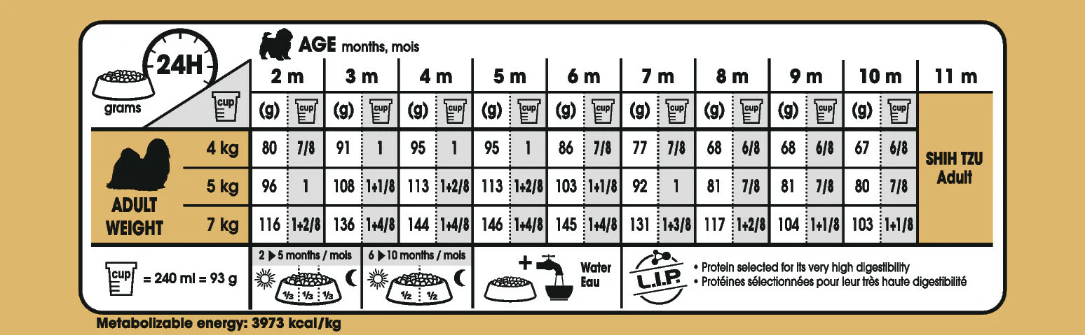 Growth is an essential stage in your dog’s life: it is the time of big changes, discoveries, and new encounters. During this key period, your Shih Tzu puppy’s natural defences develop gradually. That’s why it needs a diet containing nutrients that will support healthy growth and development. Suitable for Shih Tzus up to 10 months old, ROYAL CANIN® Shih Tzu Puppy is specially formulated with all the nutritional needs of your puppy in mind. ROYAL CANIN® Shih Tzu Puppy helps support your puppy’s immune system, thanks particularly to a patented complex of antioxidants, including vitamin E. Opulent fur is one of this breed’s major traits. The hair is long and dense with a thick undercoat, making regular brushing and assistive nutrition two important considerations to help maintain your puppy’s healthy skin and coat. ROYAL CANIN® Shih Tzu Puppy contains vitamin A and Omega-3 fatty acids EPA & DPA. It also contains an enrichment of borage oil to help support the skin’s “barrier” role to maintain skin health and nourish the coat. Additionally, ROYAL CANIN® Shih Tzu Puppy contains a combination of nutrients with high quality protein and prebiotics to support digestive health and help maintain a healthy balance of intestinal flora, which also contributes to good stool quality. The exclusive kibble in ROYAL CANIN® Shih Tzu Puppy is specially designed for this breed’s brachycephalic jaws, allowing your Shih Tzu puppy to easily pick its kibble up while simultaneously encouraging your puppy to chew. This is due to the kibble’s shape, scent and texture – tailor-made to appeal to Shih Tzu puppies like yours. At ROYAL CANIN® we’re committed to providing nutritional solutions to your pet’s needs. All of our products undergo an extensive quality control process in order to guarantee the optimum quality of food as well as catering to your puppy’s specific dietary requirements and lifestyle. This means that when your puppy eats ROYAL CANIN® Shih Tzu Puppy, it’s getting a complete and balanced diet.