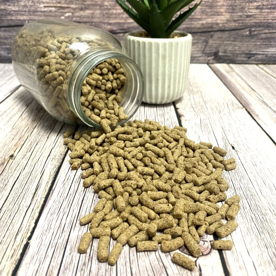 Small floating pellets with a high wheatgerm content and added spirulina, approx. 5mm in diameter, light brown colour
